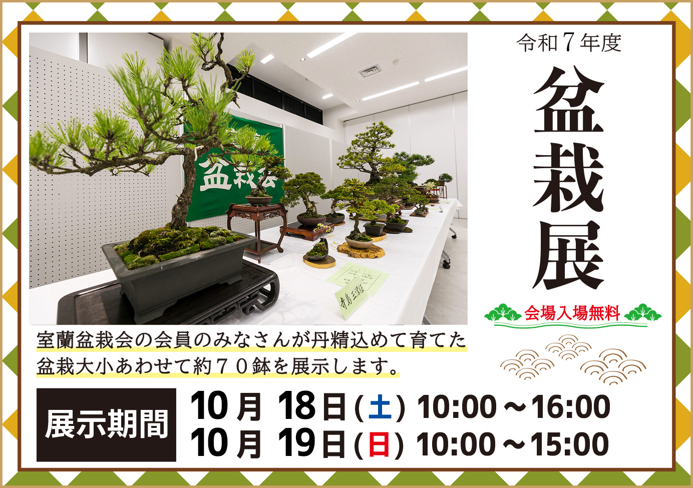 室蘭盆栽会の会員のみなさんが丹精込めて育てた盆栽大小あわせて約70鉢を展示します。