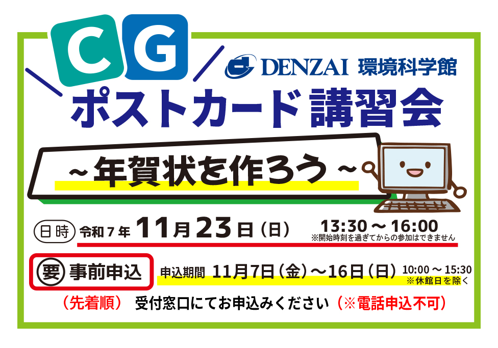 パソコンのお絵かきソフトを使って、オリジナルの年賀状などのポストカードを作ります。詳しくは下記チラシをご確認ください。