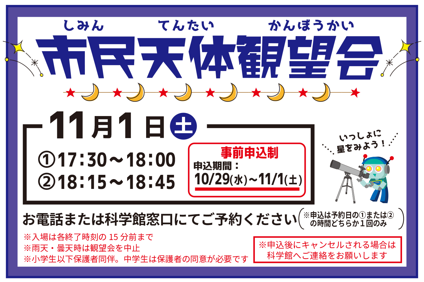 申込方法 | お電話または科学館窓口にてご予約ください 申込期間:10月29日(水)~11月1日(土) (TEL:0143-22-1058) <受付時間:10:00~17:00※11/1は16:00まで> ※申込は①または②どちらか1回のみ ※定員になり次第申込み締切(定員に空きがある場合のみ当日会場でも受付) ※申込後にキャンセルされる場合は、科学館へご連絡をお願いします |