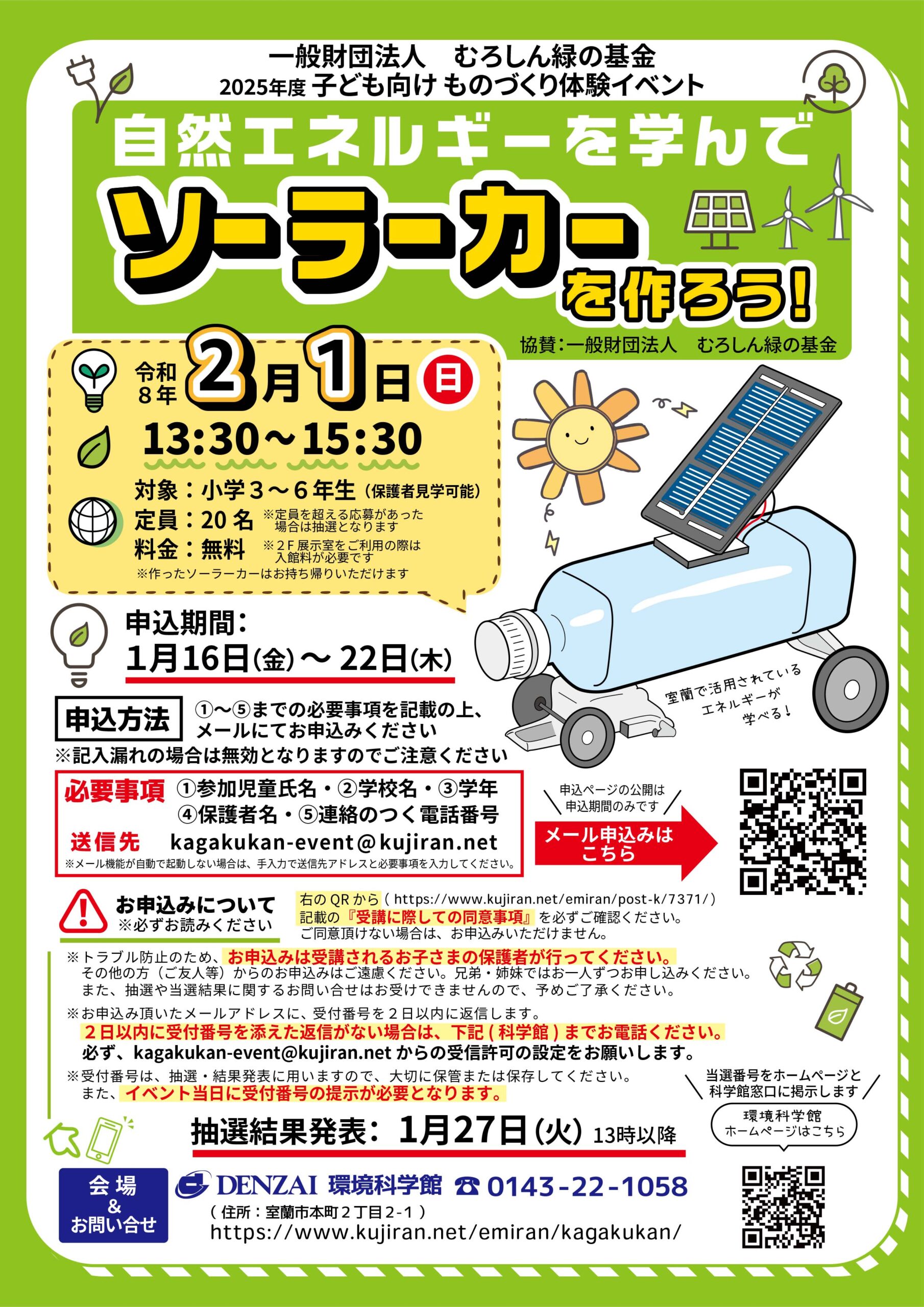 | ①講座は15分前に開場します。開始時刻の5分前までにお越しください。開始時刻を過ぎてからの参加はできません。 ②欠席される場合は必ず、科学館へ連絡してください。 ③講座当日は、汚れてもよい動きやすい服装で来てください。 ④場合によっては講座が中止になることがございます。その際は、お申込み頂いた連絡先へ事前にご連絡いたします。 ⑤講座の様子を報道各社や当館スタッフが撮影することがあります。撮影不可の場合は、講座開始前までにお知らせください。 ⑥お申込みは、受講されるお子さまの保護者(同居家族も可)が行ってください。 ※その他の方(ご友人等)からのお申込みは無効とさせていただきます。 ※ご兄弟・ご姉妹で参加を希望される場合は、それぞれ別々にお申込みをお願いします。抽選は個人ごとに行うため、兄弟・姉妹が同時に当選しない場合もありますので、ご理解のほどお願いいたします。 ※お申込み内容に「児童氏名・学校名・学年・保護者氏名・連絡先(連絡のつく電話番号)」の記載がないものは無効となります。記入漏れの無いようご注意ください。 ⑦受付時に受付番号を発行いたします。 受付番号を用いて抽選・当選発表いたしますので、大切に保管または保存してください。また、当選後もイベント当日に受付番号の提示が必要となります。 ⑧当選発表については、発表日以降にホームページと科学館受付けに当選した受付番号を掲示いたします。 当選案内のメールはいたしませんのでご注意ください。 ⑨お問合せについては、科学館窓口までお願いします。(TEL:0143-22-1058) ※2日以内に受付番号を添えた返信が無い場合は科学館までお電話ください。 ※抽選や当選結果に関するお問い合わせはお受けできませんので予めご了承ください。 ※お申込み時は必ず、「kagakukan-event@kujiran.net」からの受信許可の設定をお願いします。 ⑩個人情報の取り扱いについて、当館は、お預かりした個人情報は当該イベントのみに利用し、適正かつ安全に管理・運用することに努めます。また、法令に基づく場合を除いて個人情報を第三者へ提供することはありません。お申し込み時にお預かりした個人情報は、イベント終了後速やかに削除いたします。 |