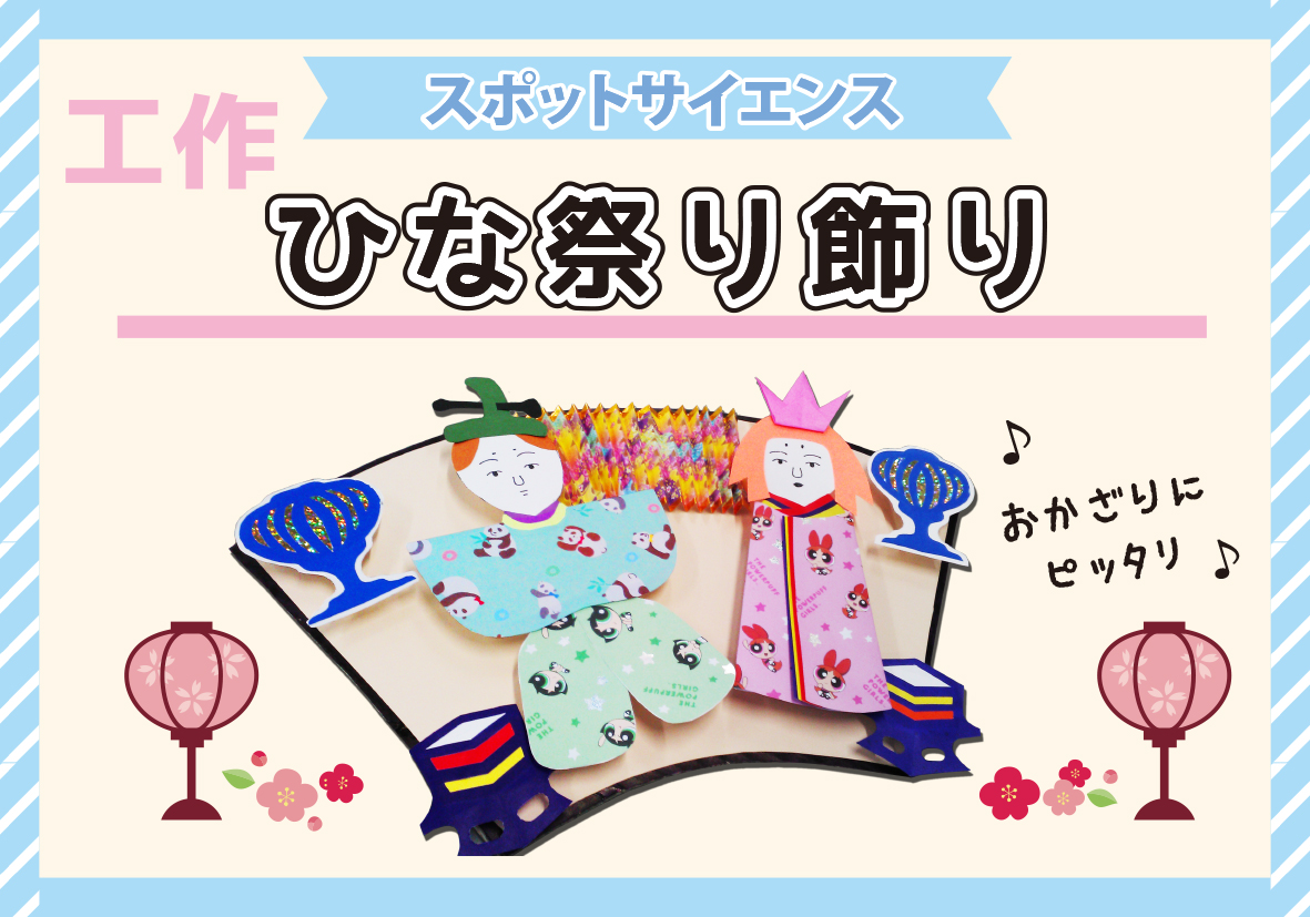 2月1日(日)工作・ひな祭りかざり 日時 令和8年2月1日(日) ①11:35 ②14:10 (各回20~30分程度) 場所 DENZAI環境科学館内 対象 どなたでも 定員 各回 8名 参加費 無料 ※入館者対象のため入館料がかかります 申込方法 当日10時より参加希望の方へ整理券を配布 (無くなり次第配布終了) 詳しい内容をみる