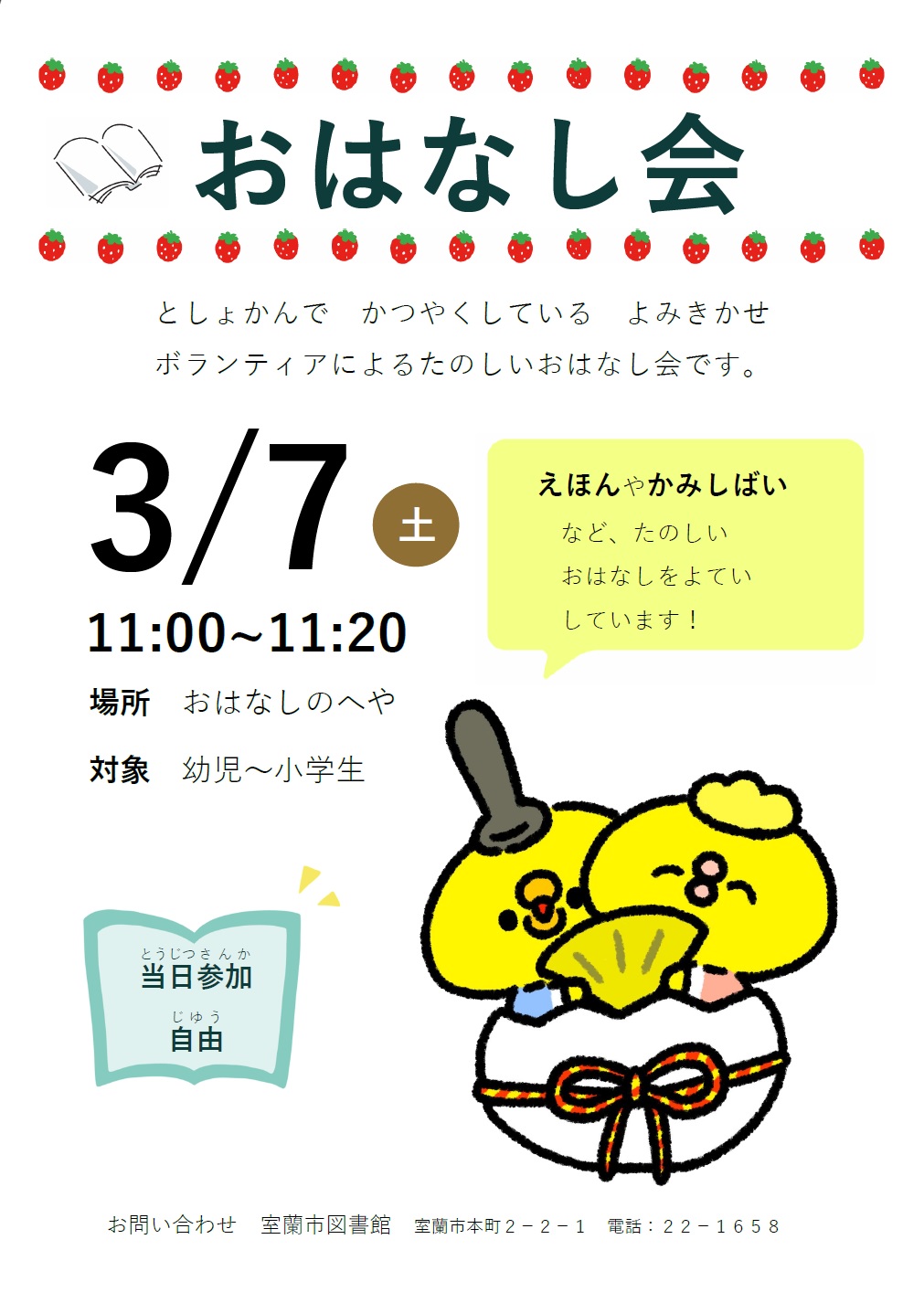 図書館ボランティアの協力によるおはなし会です。紙芝居や絵本の読み聞かせ、手遊びなどを行います。