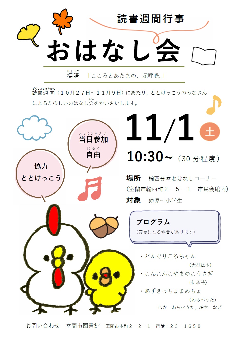 読書週間(10月27日から11月9日)にあたり、ととけっこうのみなさんによる楽しいおはなし会を開催します。