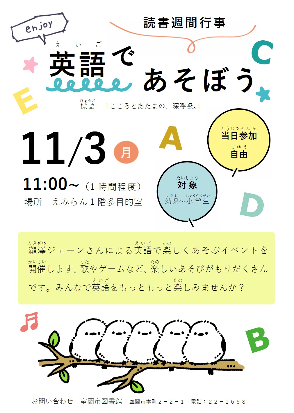 読書週間(10月27日から11月9日)にあたり、瀧澤ジェーンさんによる英語であそぼう!を開催いたします。楽しい英語の歌やカードなどを使用したゲームなど、盛りだくさんです。