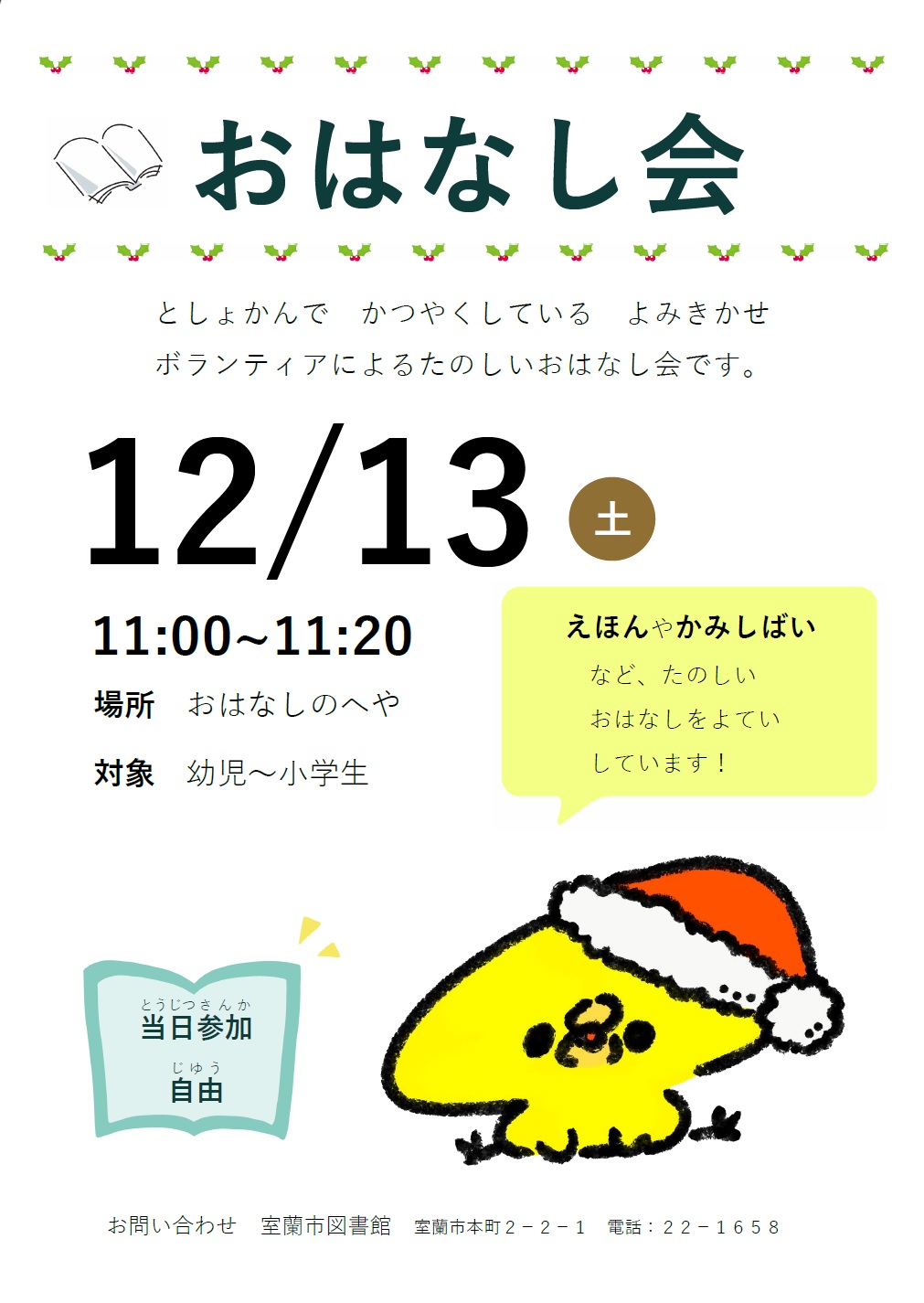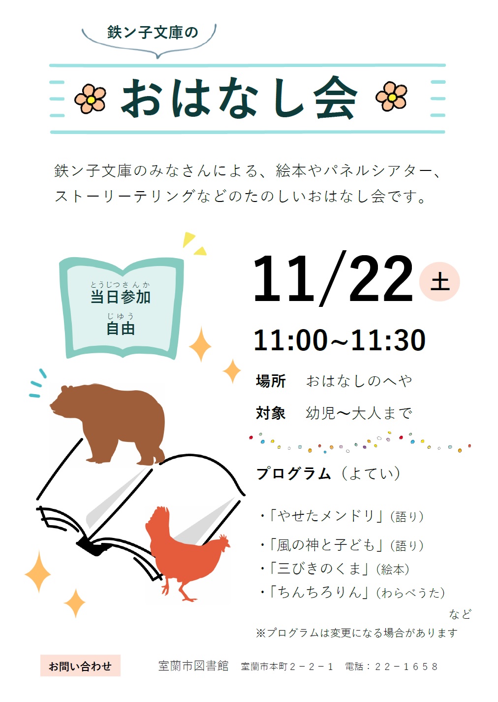 11月19日(水)ステップライブラリー(事前予約制) 日時 11⽉19⽇(⽔)10:45〜11:30 場所 えみらん1階多目的室 対象 0~3歳までの乳幼児親子 定員 先着10組程度 参加費 なし 申込方法 前日までに電話で 詳しい内容をみる
