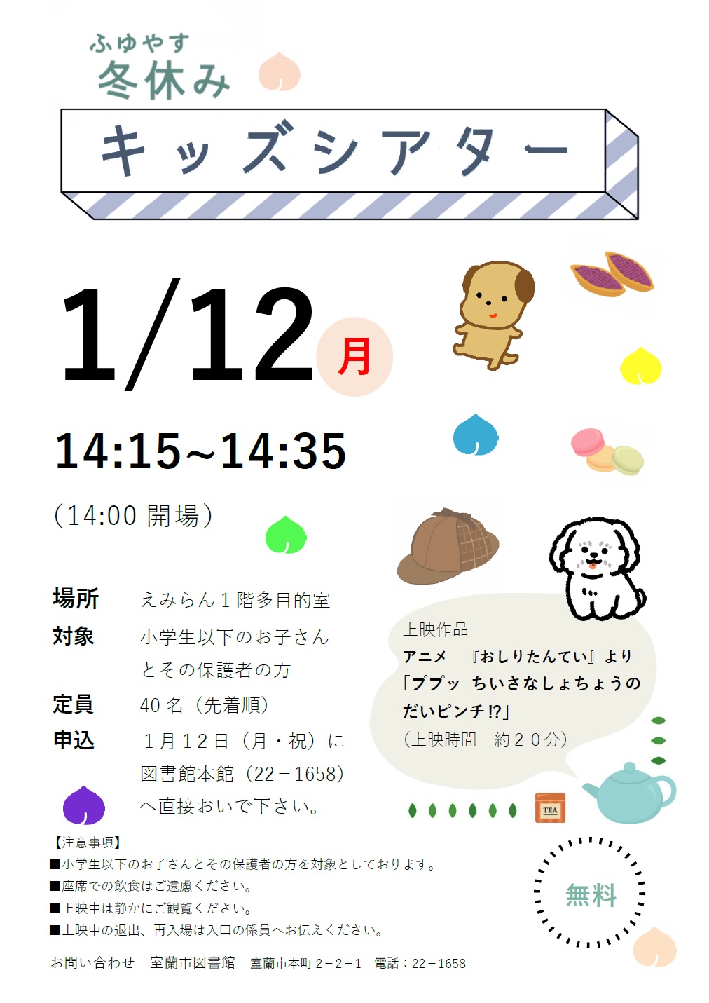 1月12日(月)冬休みキッズシアター 日時 1月12日(月) 14:15~14:35(開場14:00) 場所 えみらん1階多目的室 対象 小学生以下のお子さんとその保護者 定員 40名 参加費 無料 申込方法 当日参加 詳しい内容をみる