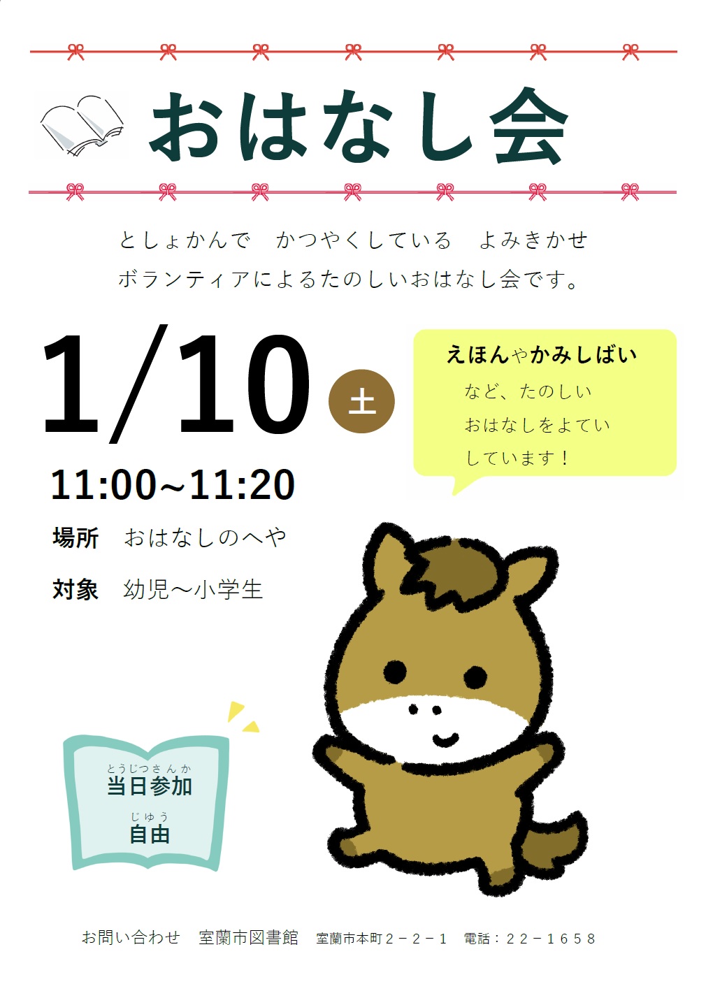 1月28日(水)ステップライブラリー(事前予約制) 日時 1⽉28⽇(⽔)10:45〜11:30 場所 えみらん1階多目的室 対象 0~3歳までの乳幼児親子 定員 先着10組程度 参加費 なし 申込方法 前日までに電話で 詳しい内容をみる